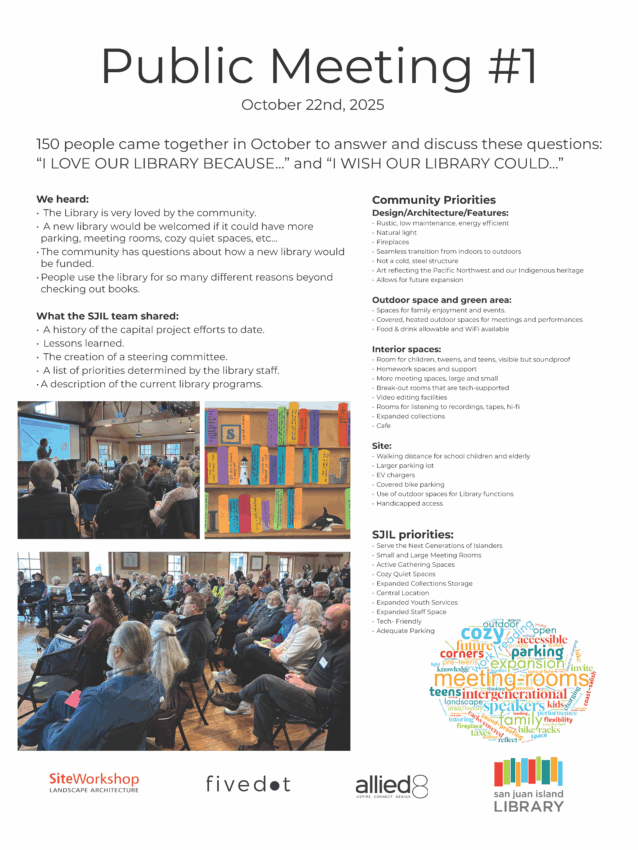 The San Juan Island Library thanks all who came to the October 22nd community meetings at the Brickworks. Between the two sessions approximately 150 people were in attendance and both sessions featured rich and engaging discussions on library planning. The Library shared updates on the new building planning process. Library Trustee Boyd Pratt spoke about the history of the new building project and the current tasks and concerns of the Library Board of Trustees. Library Assistant Director Anthony Morris reviewed the library’s current services and gave examples of how the current building cannot meet community needs. After those short speaking sessions, the majority of the time was spent listening to feedback from the community about what they would like to see in a new library. The positive creative energy of both sessions was remarkable, and many priorities were discussed, including popular ideas such as the community’s need for more meeting rooms, both large and small, and ensuring there are sufficient spaces for youth and teens in the library. The Library is grateful for all the thoughts, feedback, and constructive criticism discussed and will be using the received feedback to inform its decisions.