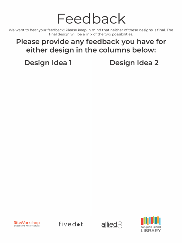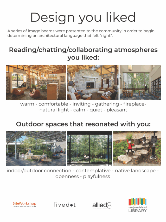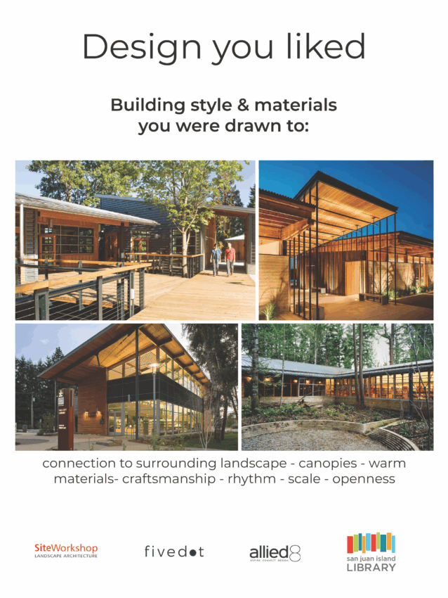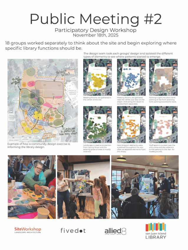 The San Juan Island Library thanks all who came to the November 18th community meetings at the Brickworks. Between the two sessions, approximately 100 people were in attendance. Both sessions featured rich and engaging discussions on library planning. After a short review of the building project, the Library’s architectural consultants divided attendees into small groups and led a design workshop. Participants were able to discuss design ideas related to the Spring Street property and the programs and services they would like in the new library. After this breakout session, all participants reconvened, and the groups presented their ideas to one another. Ideas from these presentations were further discussed and integrated into group designs.